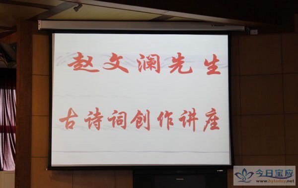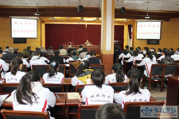 11月12日下午,在城北中学多功能厅内举办了赵文澜先生古诗词创作讲座。县委宣传部副部长、县文联主席何开文参加。 赵老今年已有八十八岁的高龄,却以清晰的逻辑思维,通熟易懂的语言,声如洪钟的气质,向爱好诗词的嘉宾和城北初中的部分学生们展现了古诗词的精髓。形象的比喻了作诗的要领,一动一静,远近相称,红绿相应,总结出一首上乘的诗要有情趣,有境界,有乐感,有空间。 赵老从他的处女作《随星乙夫子由县城往黄浦访超白先生 书道所见》开始分析:诗的来由、诗的平仄、诗的意境、诗的内涵。面对北中的殷殷学子们一一讲解剖析,让宝应人自己的诗歌文化发扬光大,得以传承!(杨璇 朱兴荣)
