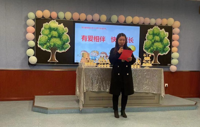 5月6日上午,宝应县城南小学三年级全体34名孩子和所有任课老师在温馨的录播教室举行了“有爱相伴、快乐成长”十岁成长仪式。 学校为每个孩子准备了一个小小的生日蛋糕,蛋糕上有每一个孩子的名字,大队部和任课老师布置场地、帮孩子准备小礼物,班主任帮忙排练节目,大家一起动手,各司其职,目的是让每一个孩子在爱的氛围里完成十岁成长仪式。 仪式上,臧校长做了“为十岁喝彩”的致辞,她要孩子懂得感恩、懂得珍惜当下时刻,好好努力。 仪式中,孩子们表演的有模有样,吹拉弹唱,全员参与,其乐融融。最后孩子们将自己的小心愿贴在小树上,希望跟小树一起长成参天大树。 学校小、人员少,我们就给孩子一个不一样的十岁成长仪式,让孩子们在童年留下难忘瞬间!