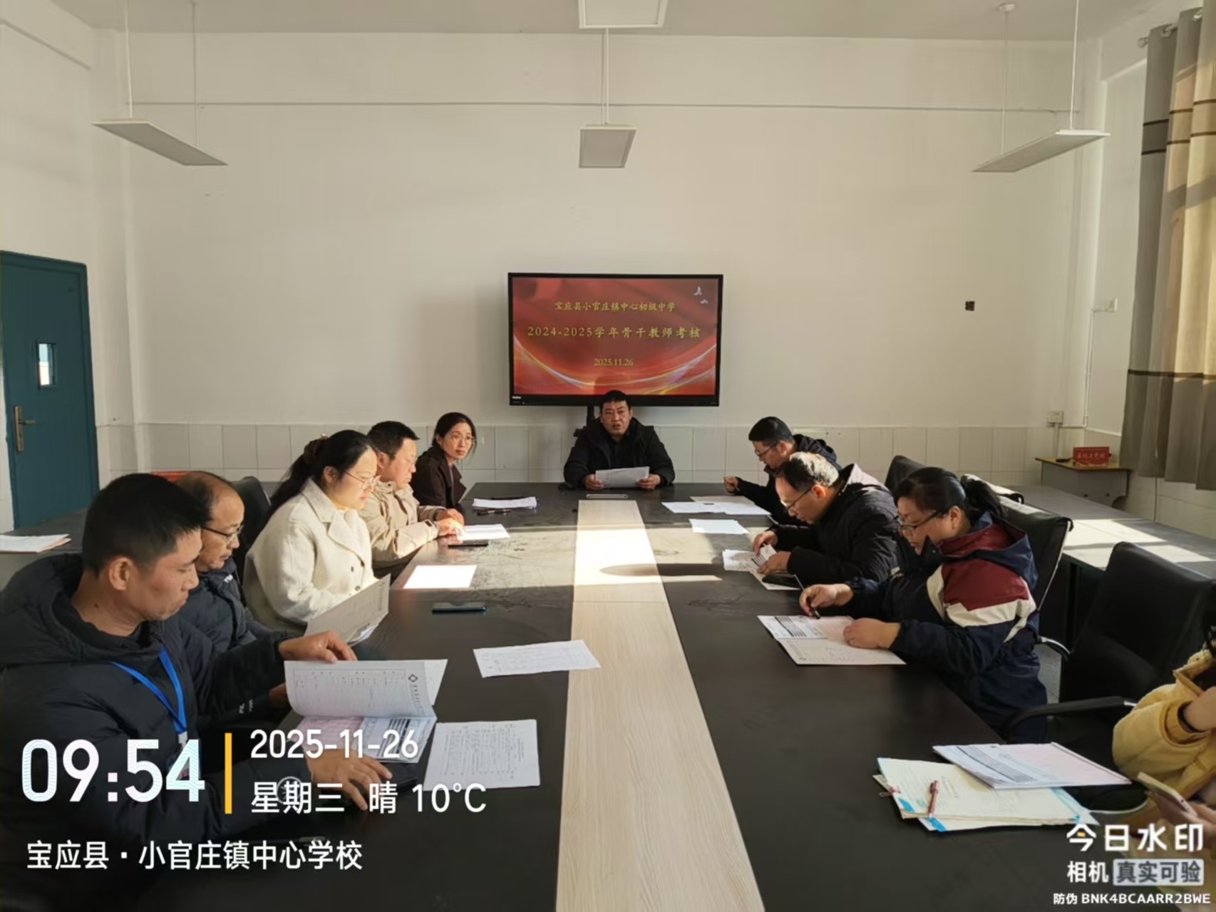 为进一步加强骨干教师队伍建设,检验骨干教师履职成效,发挥其示范引领作用,严格落实 “量化积分、实绩导向” 考核原则,11月27日上午,宝应县小官庄镇中心初级中学组织开展 2024-2025 学年度骨干教师现场考核工作。考核小组通过现场核查材料,对全校骨干教师的职业道德、教育教学、示范引领及教研科研等综合素养进行全方位核验,确保考核结果客观公正、有据可依。 本次现场考核严格依据学校制定的《市县级骨干教师考核积分表》,由校长室牵头,联合教务处、政教处、总务处及部分教师代表组建专项考核小组,明确分工、细化流程。考核现场设置材料核验区,对应积分表“职业道德、教育教学实绩、示范指导与专业提升、教研科研”四大核心考核板块有序推进。 考核小组始终坚持 “客观公正、量化精准、实绩为王” 的原则,对每一项考核指标都现场核查材料、当面核实情况、即时登记积分,确保考核过程公开透明、考核结果真实可信。参与考核的骨干教师纷纷表示,现场考核既检验了自身年度工作成效,也通过指标核验明确了后续提升方向。