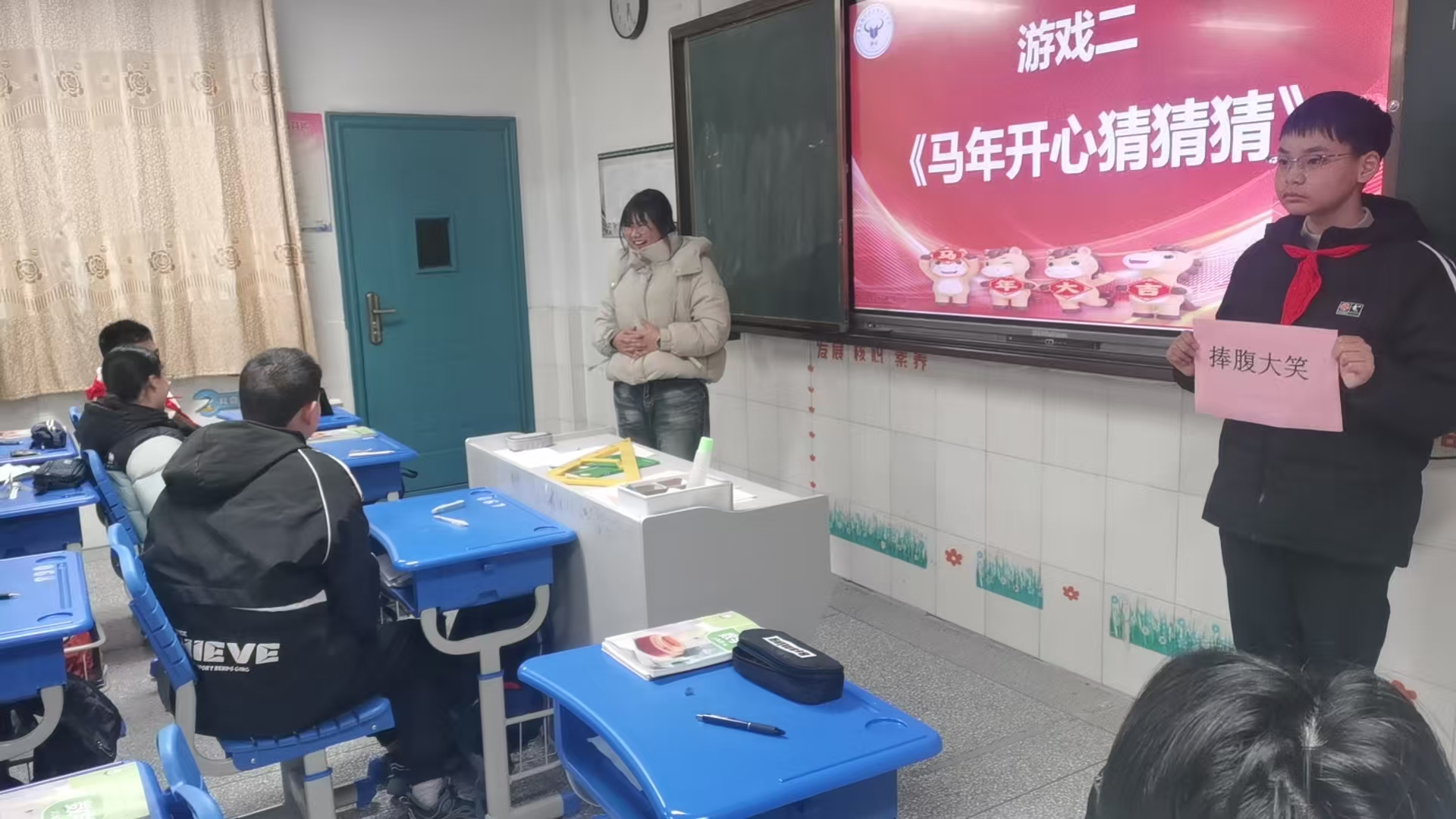 各班活动现场,夹书竞走考验专注力与协调性,同学们步伐稳健、默契配合;猜成语游戏妙趣横生,大家踊跃抢答、共学共进;手势舞练习整齐划一,传递青春正能量;合唱环节歌声嘹亮,唱响奋进新征程的心声。