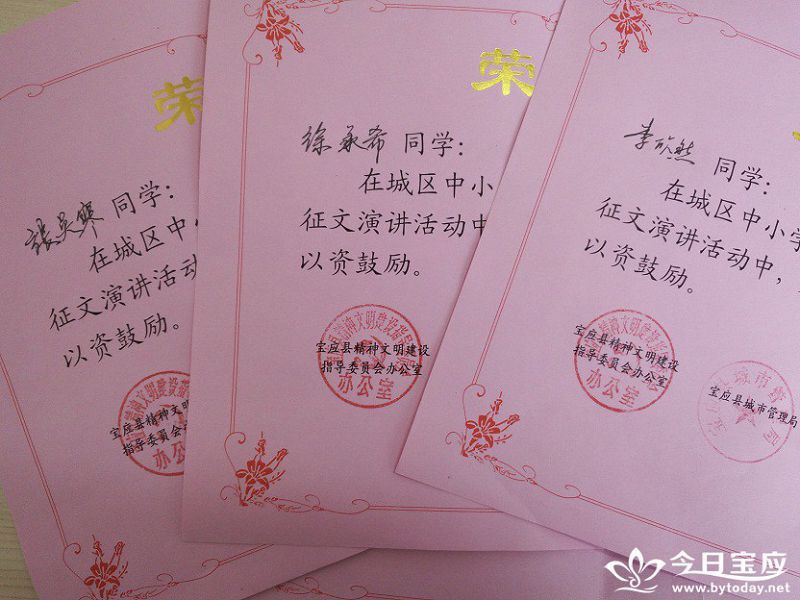 近日,在宝应县精神文明建设指导委员会办公室等单位联合举办的“城市是我家,管护靠大家”征文比赛活动中,县泰山小学六(1)班李欣然同学的《桂子正飘香》一文喜获全县小学生征文大赛一等奖,徐承希等六名学生分获二、三等奖,该校龚玉凤老师同时喜获征文比赛优秀指导老师奖。 据悉,本次活动由县精神文明建设指导委员会办公室、城市管理局、教育局、广播电视台、宝应日报社联合举办,旨在引导广大学生积极参与文明创建,做文明人,行文明事,说文明话。增强学生城市“主人翁”意识,遵守城市管理各项规定,营造良好氛围。 |