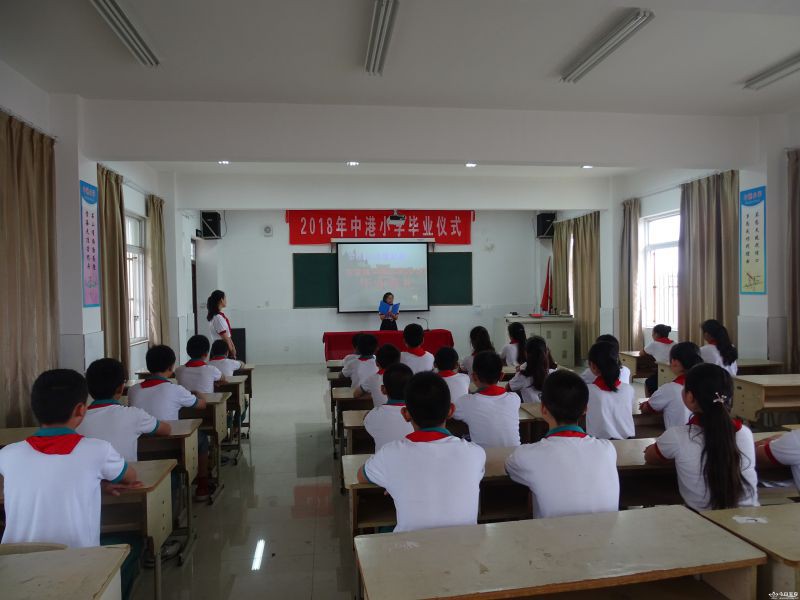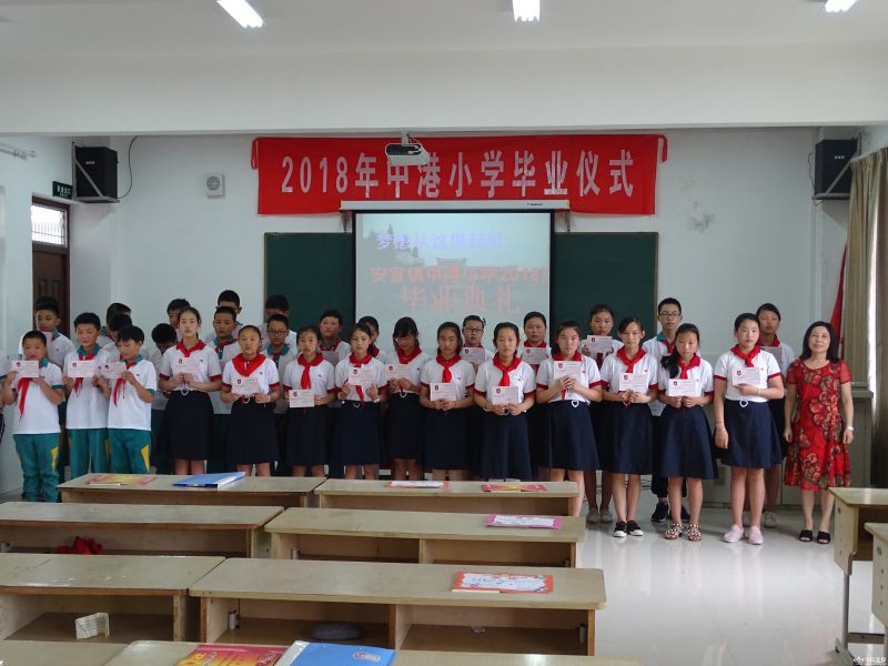 6月28日上午,安宜镇中港小学六年级全体师生齐聚至信楼三楼多功能厅,共同参加该校2018届毕业典礼。 毕业典礼由大队长嵇思佳主持,她首先通过播放孩子六年来的成长图片,分享孩子们成长的成功与快乐。接着学生代表发言,感谢老师的谆谆教诲,感谢母校的精心培养。学生们通过表演《感恩的心》、《我们毕业了》等节目,表达自己离别心情。邀请赵宝元校长宣读了学校关于表彰优秀毕业生决定,并为他们颁奖。接着赵校长宣读了本次毕业生名单,并为每一个毕业生颁发毕业证书。最后赵校长代表学校宣读给即将毕业学生的一封信。要求孩子知道感恩父母、感恩老师、感谢同学、感谢我们伟大的祖国;勉励孩子继续努力,调整自己,积极适应初中生活,交流了暑期的努力方向。最后他希望孩子们常会母校看看,让老师一起分享你的幸福与快乐。嵇思佳邀请班主任杨萍老师代表全体老师讲话。杨老师感慨万千,即将退休的她带这个班4年,感谢孩子陪伴,页对学生的成长提出殷切希望。最后师生以共唱《港小之歌》形式结束了毕业典礼! 一个多小时的毕业典礼没有一个同学随便讲话,他们认真听着,想着。杨主任的的话:“港小永远是你们的家,老师们会默默关注你们的成长,也希望同学们有空回母校看看!让我们共成长!”一定会记在孩子们心中。