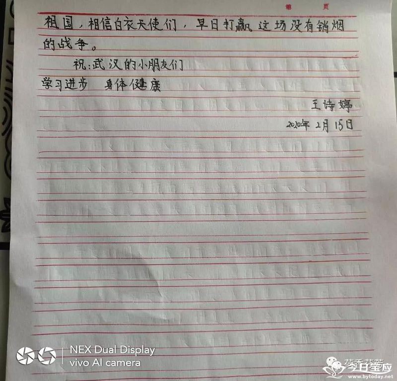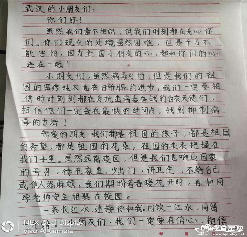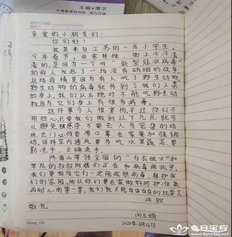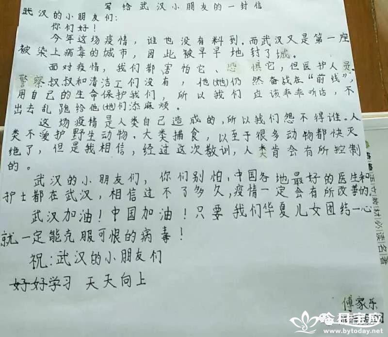 | 荷娃无所有,遥寄信一封 ——望直港镇中心小学开展给武汉小朋友写一封信活动 新型冠状病毒肺炎疫情发生之际,全国同舟共济、众志成城,打响了一场没有硝烟的疫情阻击战,可以说每一个中国人,都是这场战役的战士。对于这场灾难,望直港镇中心小学的孩子们也没有置身事外,他们纷纷拿起手中的笔用书信形式,表达对疫区武汉小朋友的关心和美好祝愿。 孩子们文字虽然稚嫩,但我们从中可以聆听到爱的声音,感受到他们纯真的心灵。大家相信:祖国明天会更好!疫情过后,祖国一定会更繁荣富强!待到烟花三月之时,孩子们还诚挚邀请武汉小朋友相聚荷藕之乡,共赏明媚春光!同描祖国灿烂未来!(赵启志 万娟)        |