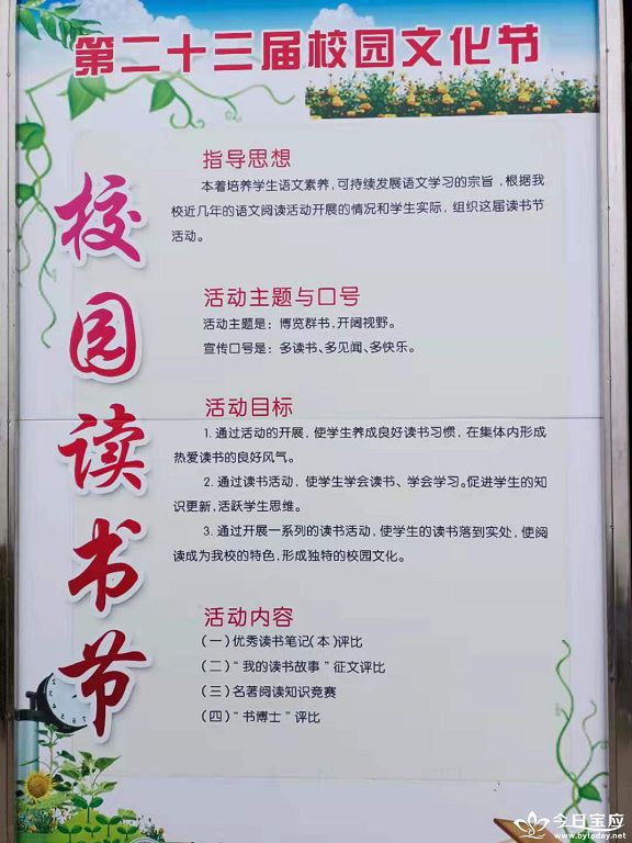 官中: “读书节”饕餮盛宴,“一百工程”深入开展 宝应县小官庄镇中心初中 杨文红 为认真贯彻落实《扬州市教育局关于大力倡导实施“五个一百工程”的指导意见》文件精神,培养学生人文科学情怀,官中精心组织了23届校园“读书节”活动。 “读书节”12月1日开始,历时半个月。主要活动有班级图书角评比、优秀读书笔记评比、“我的读书故事”征文评比、名著阅读知识竞赛、书博士评比、读书节文娱汇演等。官中四百多位学生人人积极参与活动,校园书香浓郁。 本届读书节活动提高了学生综合素养,陶冶了学生情操,取得了良好的效果。 |