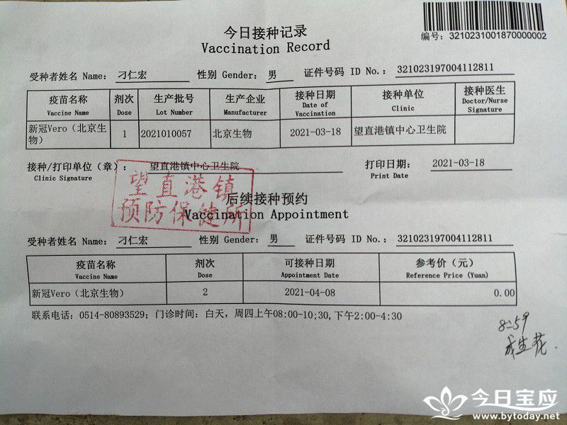 望中近百名教师接种新冠疫苗 望直港镇中心初中 刁仁宏 3月18日—19日,望直港镇中心初中近百名教师,顺利接种新冠疫苗。 两天之内,在不影响正常上课的情况下,老师们相互协调,分8批次,携带身份证,全程佩戴口罩,在镇中心卫生院有序排队、登记、接种、观察,顺利进行了第一针新冠疫苗接种工作,为师生健康保驾护航。 至目前无不良反应记录,第二针接种将在4月8日进行。 |